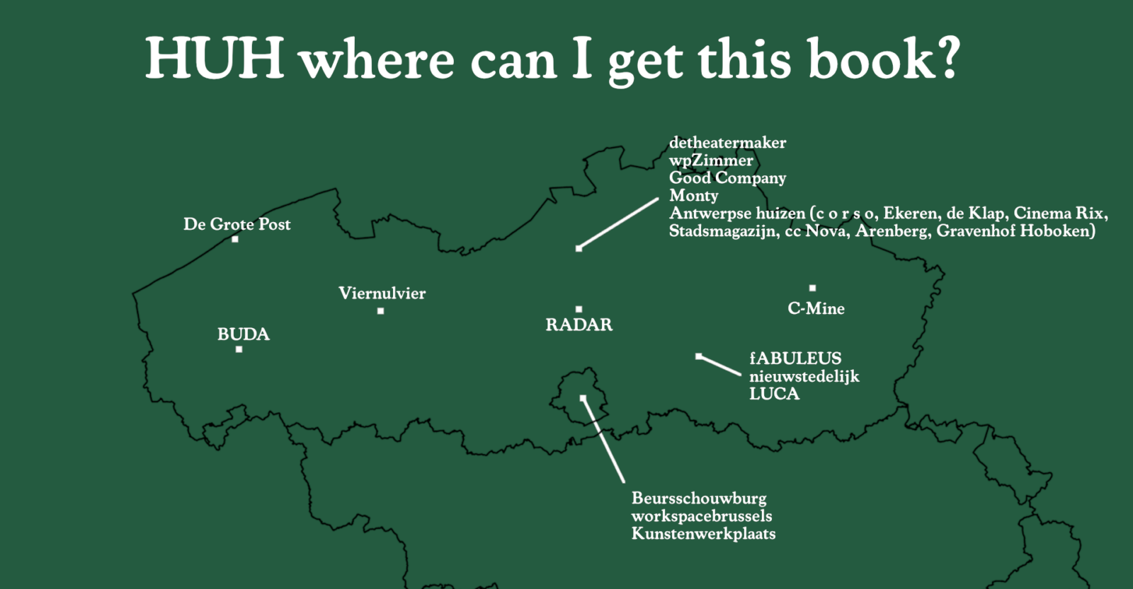 Het is verkrijgbaar in het Nederlands en in het Engels bij verschillende kunstruimtes en culturele centra in Vlaanderen en Brussel, tegen een democratische prijs of zelfs gratis.
